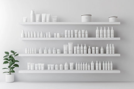 3D render of a white shelf with numerous products on it, against a white background, simple and minimalistic, in a front view. --ar 3:2 --v 6.1 Job ID: 86fc7737-b2dd-44d8-88c7-d6f547526865