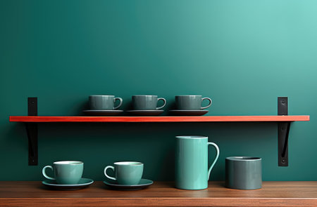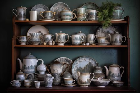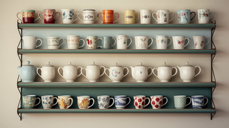 A shelf with cups and mugs on it, AI