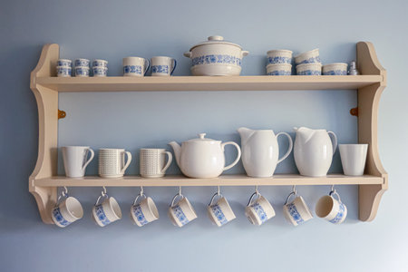 Ceramic tableware collection decorating a wooden shelf, creating a cozy and organized kitchen ambiente. Cotswolds countryside, England