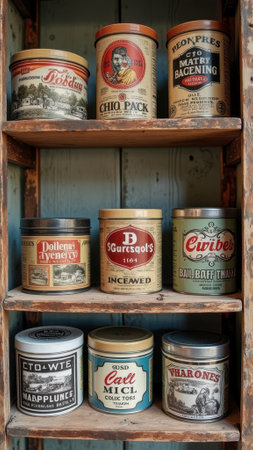 Vintage food tins on wooden shelf exuding nostalgic charm and historical appeal. That the image is generated using AI.