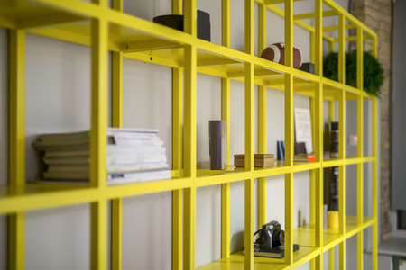 Stylish metal yellow shelves with magazines, some books, photo camera, plant and other accessories. Closeup. Horizontal.
