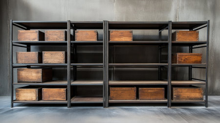 This image showcases modern industrial shelves featuring wooden storage bins, perfect for enhancing organization and style in any interior space.