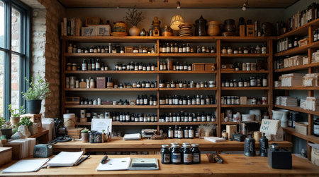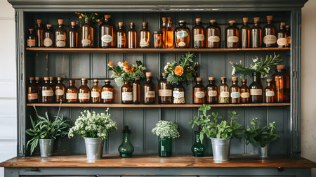 Charming apothecary shelves brimming with vintage bottles and jars create a warm, inviting, and nostalgic atmosphere.