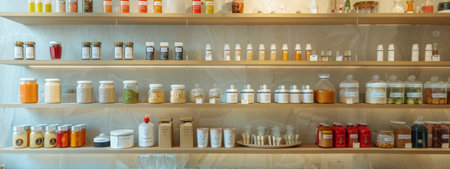 This image features neatly organized kitchen shelves showcasing a variety of containers and jars. Ideal for home organization and minimalistic design.