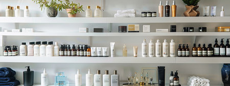 This image features a curated collection of skincare and haircare products displayed on stylish shelving in a trendy interior, showcasing modern aesthetics and a welcoming atmosphere.