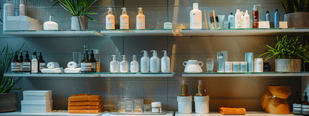 A modern bathroom shelf showcases a collection of sleek skincare and haircare products in elegant bottles, emphasizing a minimalist and stylish aesthetic perfect for contemporary spaces.