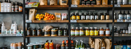 Neatly organized organic products displayed on wooden shelves in a modern store, featuring eco-friendly packaging and a clean, minimalistic retail environment.