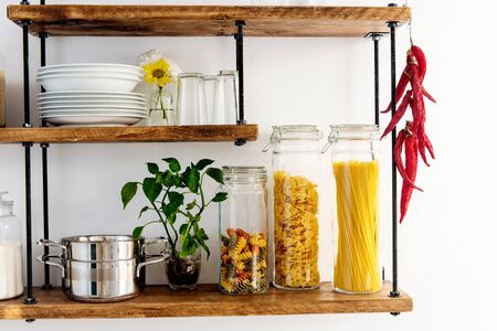 Jars with different spices, raw pasta and kitchen utensils on shelves