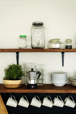 The tableware arranged on a white shelf
