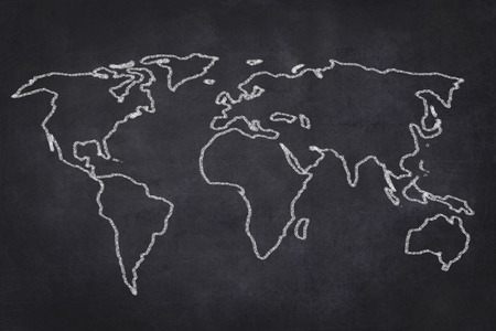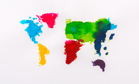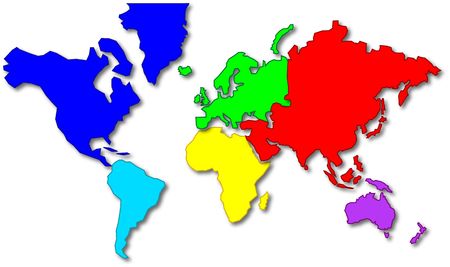 Abstract world map illustration with colorful continent silhouette outline in hand drawn pen doodle style. EPS10 vector.