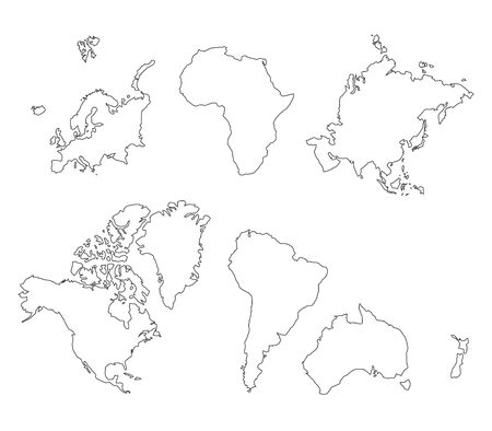 Simplified black outline of world map divided to six continents with labels. Simple flat vector illustration on white background.