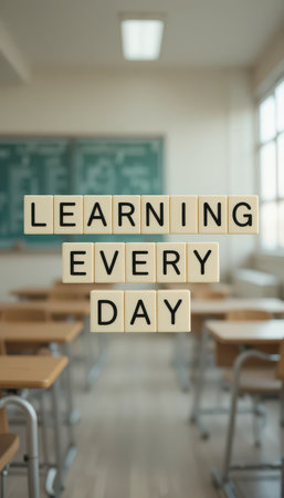 Inspiring Learning Every Day message displayed in a classroom, featuring desks and a chalkboard, perfect for conveying the essence of education and motivation.