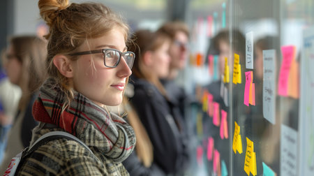 Group of employees brainstorming with sticky notes on a glass wall Generative AI