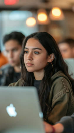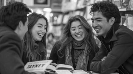 A group of young adults in a cozy cafe, engaging in conversation and activities, with a laptop and camera present