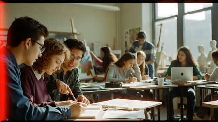 Students engaged in studying at a library table, surrounded by bookshelves and learning materials, evoking focus and collaboration