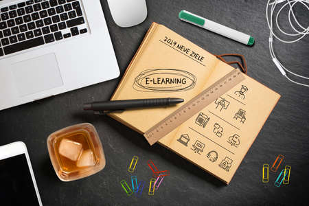 components of digital learning as icons on a notebook and the word e-learning and new goals 2019 in German