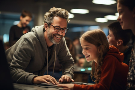 A group of people are working on a laptop together. The man in the black shirt is looking at the screen and the others are looking at him. Scene is collaborative and focused