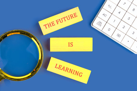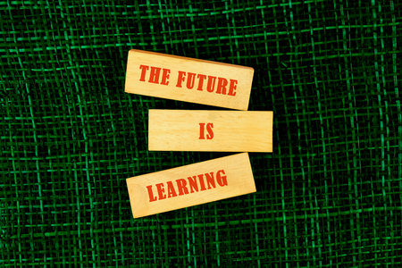 Concept of Intelligence, science and mind. THE FUTURE IS LEARNING assembled from blocks on a light green background, top view.