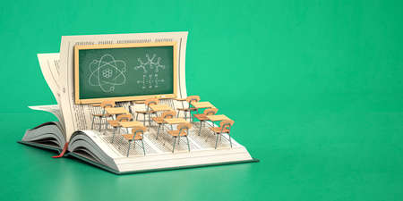 Open book and classroom with blackboard and school desks ion green background. Back to school, learning over education concept. 3d illustration