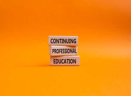 Continuing Education symbol. Concept words Continuing Professional Education on wooden blocks. Beautiful bright orange background. Business and Education concept. Copy space