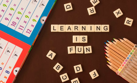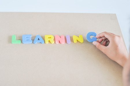 Learn, word in wooden alphabet letters isolated on colourful background with copy space