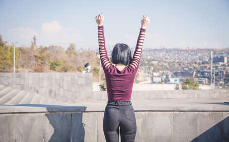 Silhouette of woman on the dramatic cloudscape during sunset. concept of excitement, emotion and happiness