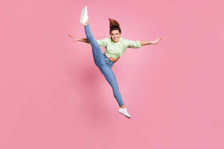 Full length body size view of her she nice attractive lovely slender energetic cheerful cheery girl jumping making doing twine exercise having fun isolated over pink pastel color background