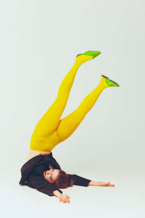 Film effect. Portrait of young stylish girl in yellow tight and black jacket posing with legs up isolated over grey studio background. Concept of retro fashion, art photography, style, queer, beauty