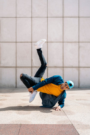 Cool dancer doing handstand in the street against white wall and looking at camera.