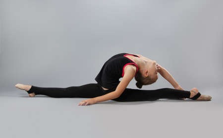 Attractive girl gymnast performs a complex exercise. Flexibility, stretching. girl in a training suit on a gray background in the Studio