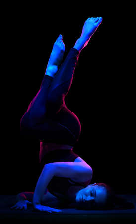 Young fit woman practicing yoga. Neon light. Modern sci fi representation of yoga. Calm and tranquil atmosphere