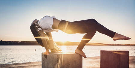 Flexible woman doing split outdoor on the dramatic sunset background. Concept of yoga, healthy lifestyle and stretching