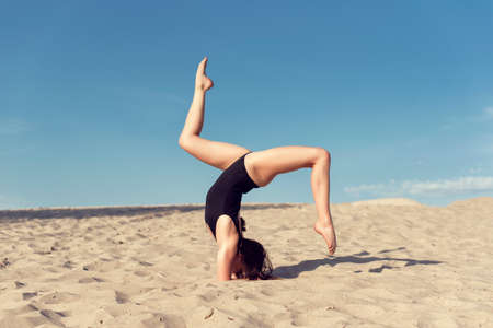 Fitness yoga woman stretching on sand. Fit female athlete doing yoga pose.