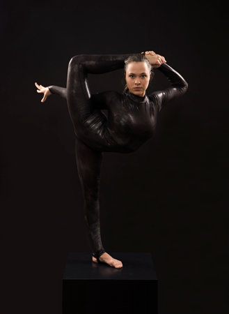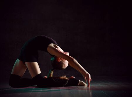 Flexible girl doing a gymnastic exercise on a black background. Sport. Fitness. Stretching.
