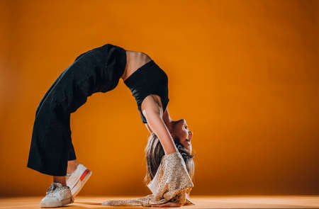 Flexible athletic girl during an intense dance exercise in modern orange studio