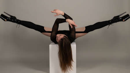 In the frame on a gray background. A young woman, demonstrating dance moves in the direction of high heels, lying on the floor. Shes wearing an open shirt next to her black jacket. Shes sexy, plastic