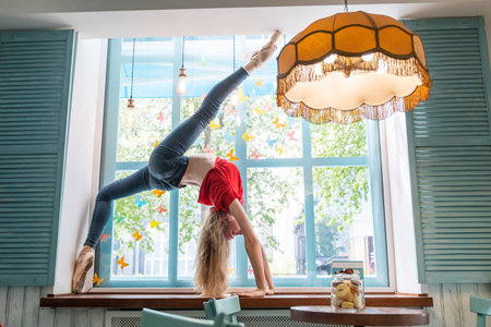 Flexible girl practice stretching and handstand at home. concept of healthy lifestyle and yoga