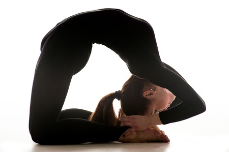a young girl in blue jeans and a black bodysuit makes a bridge on a white background.