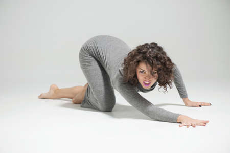 Beautiful girl doing acrobatic and flexible trick on white floor and white wall on background