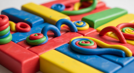 Colorful toy bricks with unique textures and interlocking designs create playful patterns