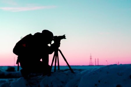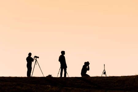 Silhouette of a professional landscape travel photographer holding a camera on a mountain. Silhouettes of many professional photographers posture in the evening