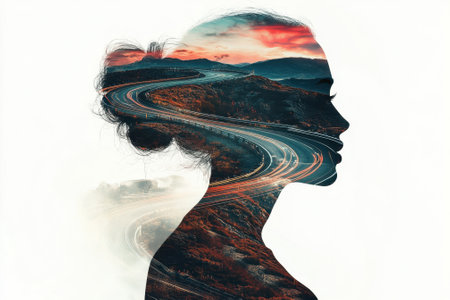 Woman silhouette merging with winding mountain road at sunset in double exposure effect