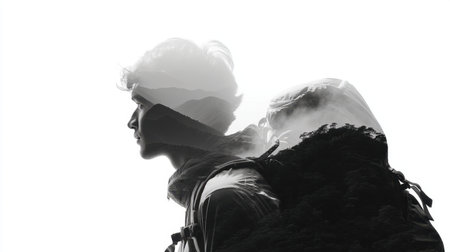 Young male hiker stands profile, showcasing double exposure effect with mountain landscape integrated into his silhouette. image conveys sense of adventure and exploration, highlighting connection