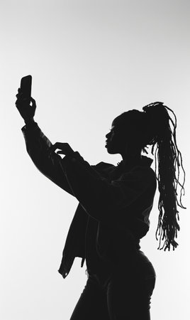 silhouette of black african american woman taking selfie in minimalist black and white setting, highlighting her braided hairstyle and modern, stylish look. High quality photo
