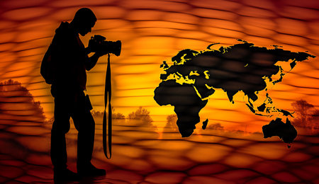 Silhouette of photographer with camera and world map on abstract background ai generated