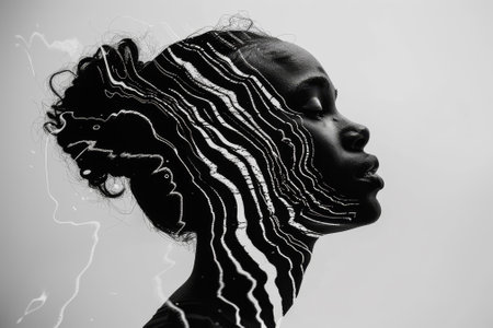 Silhouetted african female profile with abstract layered design on vibrant orange background.
