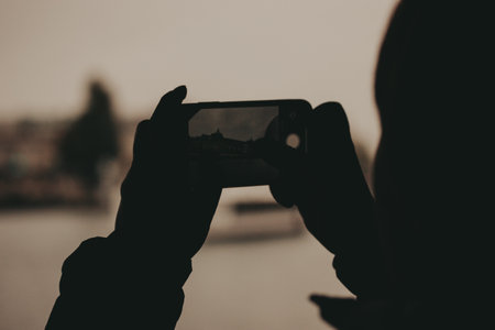 Silhouette of a person taking a photo of a building with a smartphone. A person is silhouetted against a blurred background, holding a phone to capture image. The scene is bathed in soft natural light
