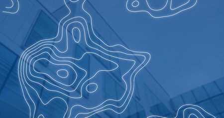 Image of topography against low angle view of tall building. Global networking and business technology concept