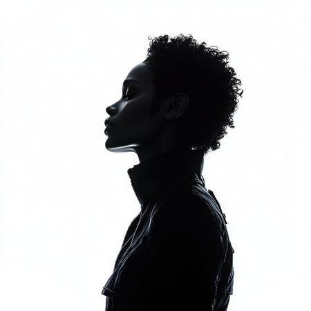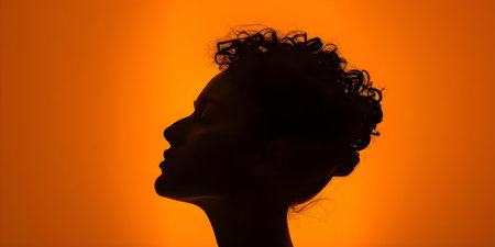 A striking profile of a woman with curly hair poses gracefully, illuminated from behind.