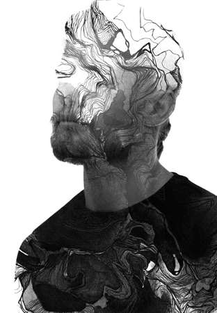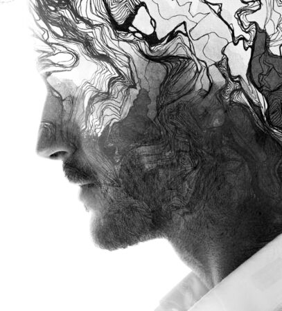 Paintography. Double exposure profile portrait of a man with strong features combined with handmade painting of wavy lines which dissolve into his skin